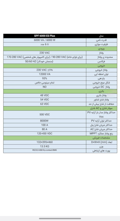 سانورتر مدل Growatt SPF6000 ES Plus یکی از محبوب ترین سانورتر های موجود در بازار است که میتواند توان خروجی برابر با ۶ کیلووات مناسب مصارف خانگی و کسب کار های کوچک را فراهم سازد؛همچنین این دستگاه با بهره مندی از شارژر کنترل ۱۰۰ آمپری روند شارژ باتری ها را تسریع کرده. این دستگاه قابلیت اتصال به برق شهر؛پنل خورشیدی و حتی دیزل ژنراتور را دارد.